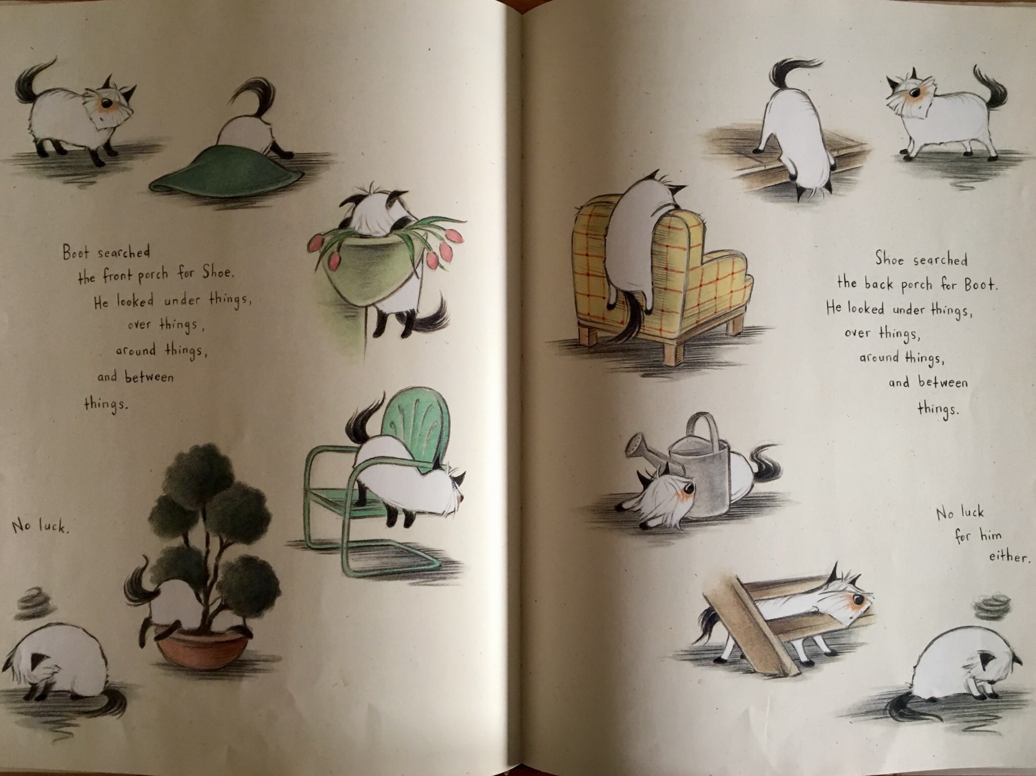 Boot and Shoe have been together since they were puppies. While they enjoy doing most things together, they have their own interests as well. Boot likes to lounge about on the back porch all day and Shoe enjoys hanging out on the front porch. However, their blissful Utopia is upset when a mischievous squirrel lures them both away from their perches. A barking extravaganza full of confusion leaves them both winded and on the opposite porch. Boot waits for Shoe and Shoe waits for Boot. They are both worried about the other. They even check the opposite porch but at the same time. After a long miserable evening they are reunited when they meet at their favorite bathroom spot.