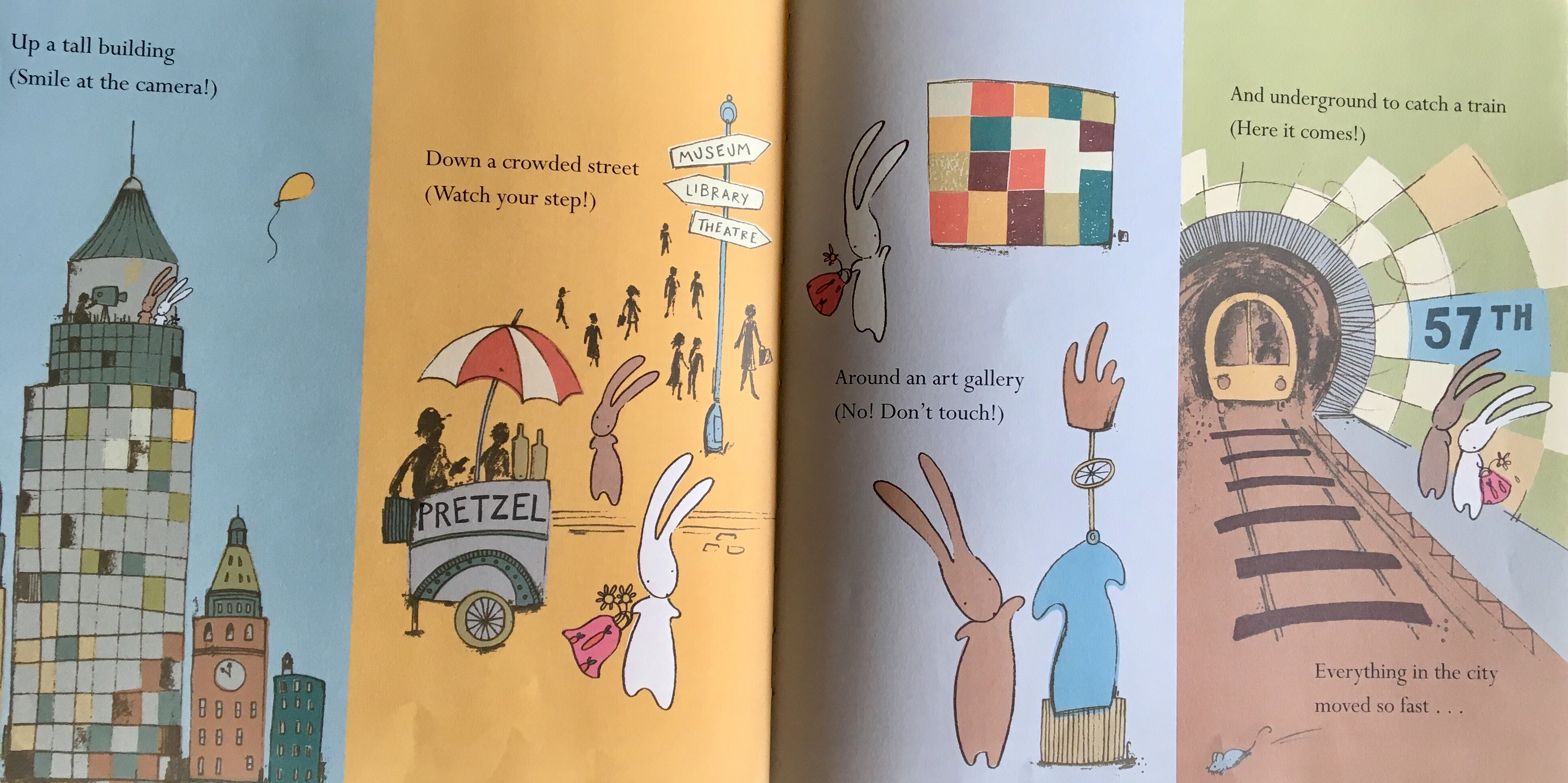 Russell’s story begins with Brown Rabbit as he makes his way to the city to visit his friend, Little Rabbit. He’s not been to the city before and Little Rabbit is determined to make the most of his visit. Barely taking a moment to breathe, they breeze through the city, much to Brown Rabbit’s dismay. The last item on their daily agenda is to attend a party, but Brown Rabbit is too tired to dance. When Little Rabbit returns to their table, she finds that he is no longer there. She realizes that in her effort to show him everything, she essentially ignored him all day. Luckily, Brown Rabbit is pretty easy going and after a little chat, everything is set to rights. The two friends spend the next day at a much more relaxed pace and end the book just enjoying being in each other’s company.