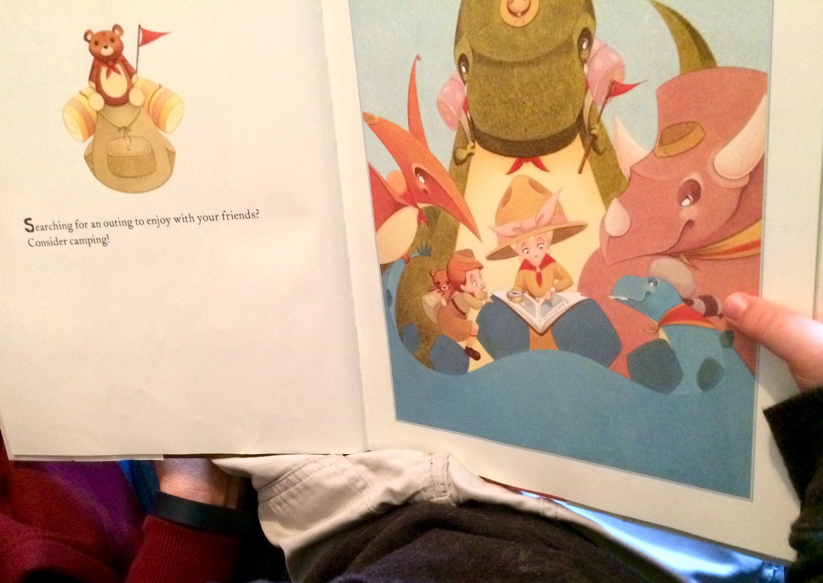 The book is laid out as a guide to camping and hiking in the great outdoors but it’s soon evident that even though all the characters (dinosaurs included) are wearing scout uniforms, they don’t know anything about camping. They’re respectful but constantly at odds with the nature surrounding them. In the end, they return to they’re backyard enjoying the most honored of camping traditions from the comfort of their own home, roasting marshmallows.