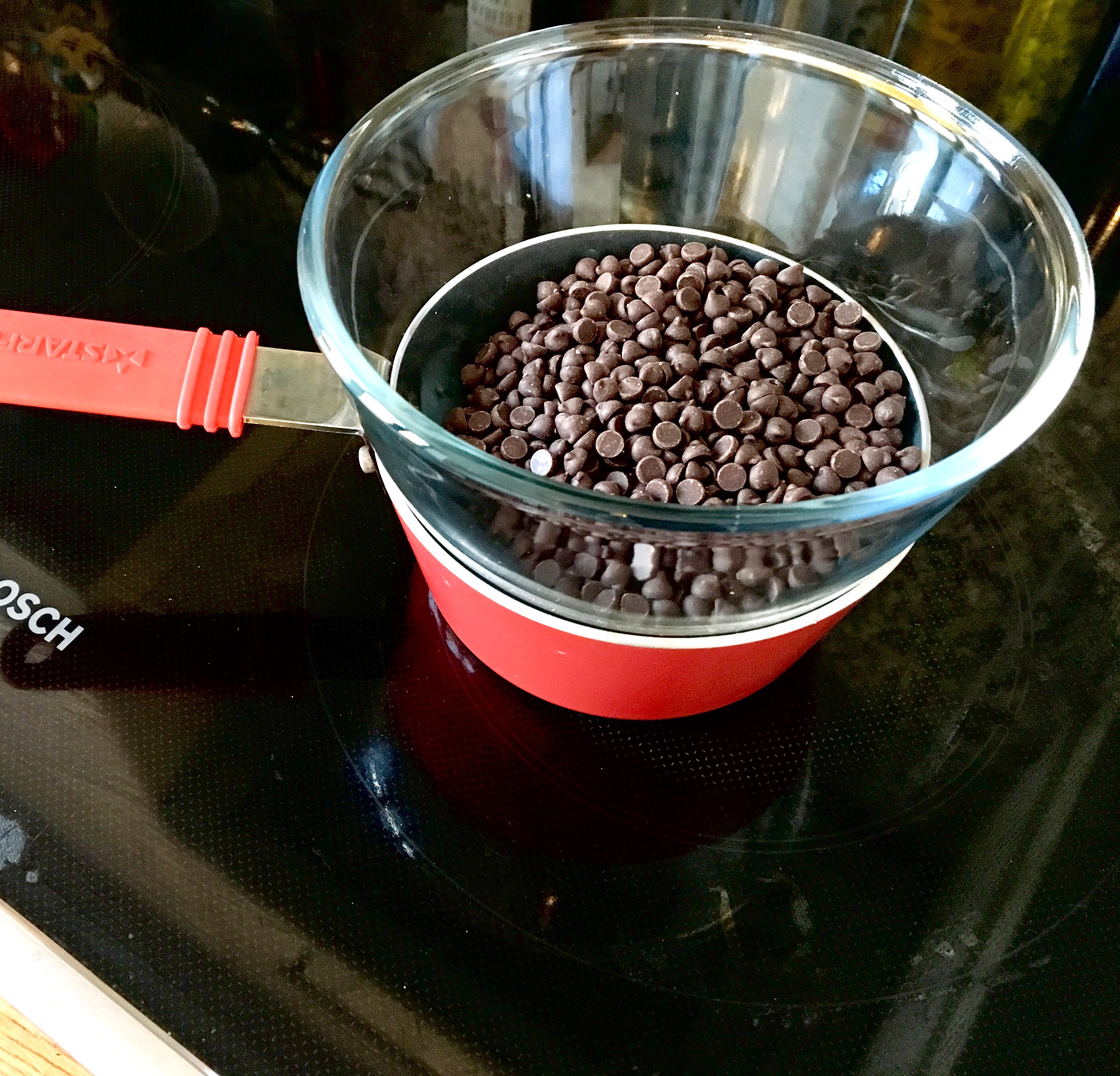 Add the chocolate chips to a double boiler. You don’t need a big one. As you can see I’ve set mine in a small glass mixing bowl.