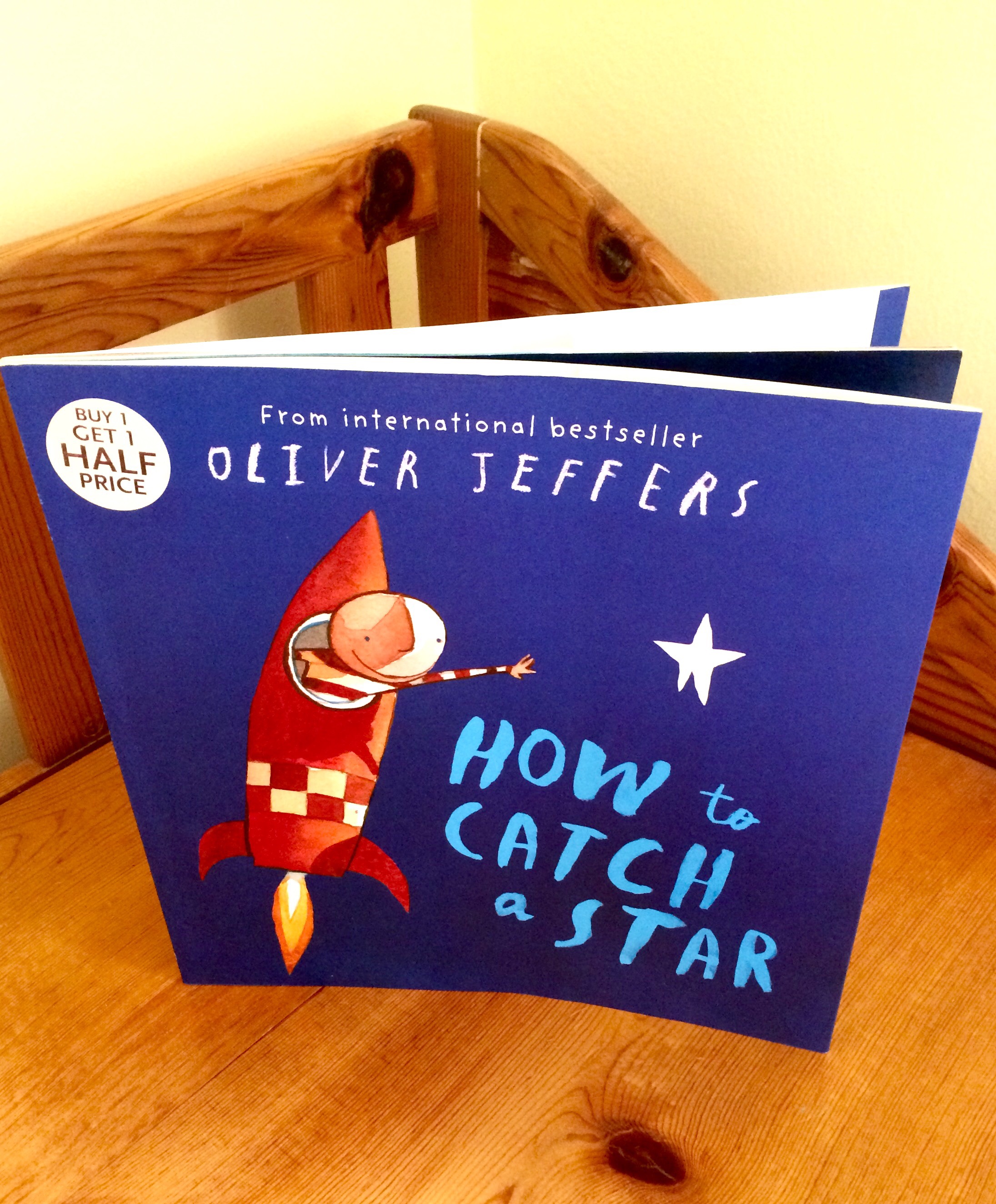 The Low Down: I’m not sure why but I always feel rushed in some book stores. Some you don’t mind strolling until kingdom come and others…well, I feel like I need to find what I need and go. GO NOW! Maybe it’s the lighting. I don’t know. That’s how I ended up purchasing How to Catch a Star. It was an add on for a buy one get one sale. I picked up a book about owls, that turned out to be a dud, and then grabbed How to Catch a Star. I opened to the page that read how the little boy couldn’t take his spaceship to get the star because it’d run out of petrol, chuckled, and headed toward check out.