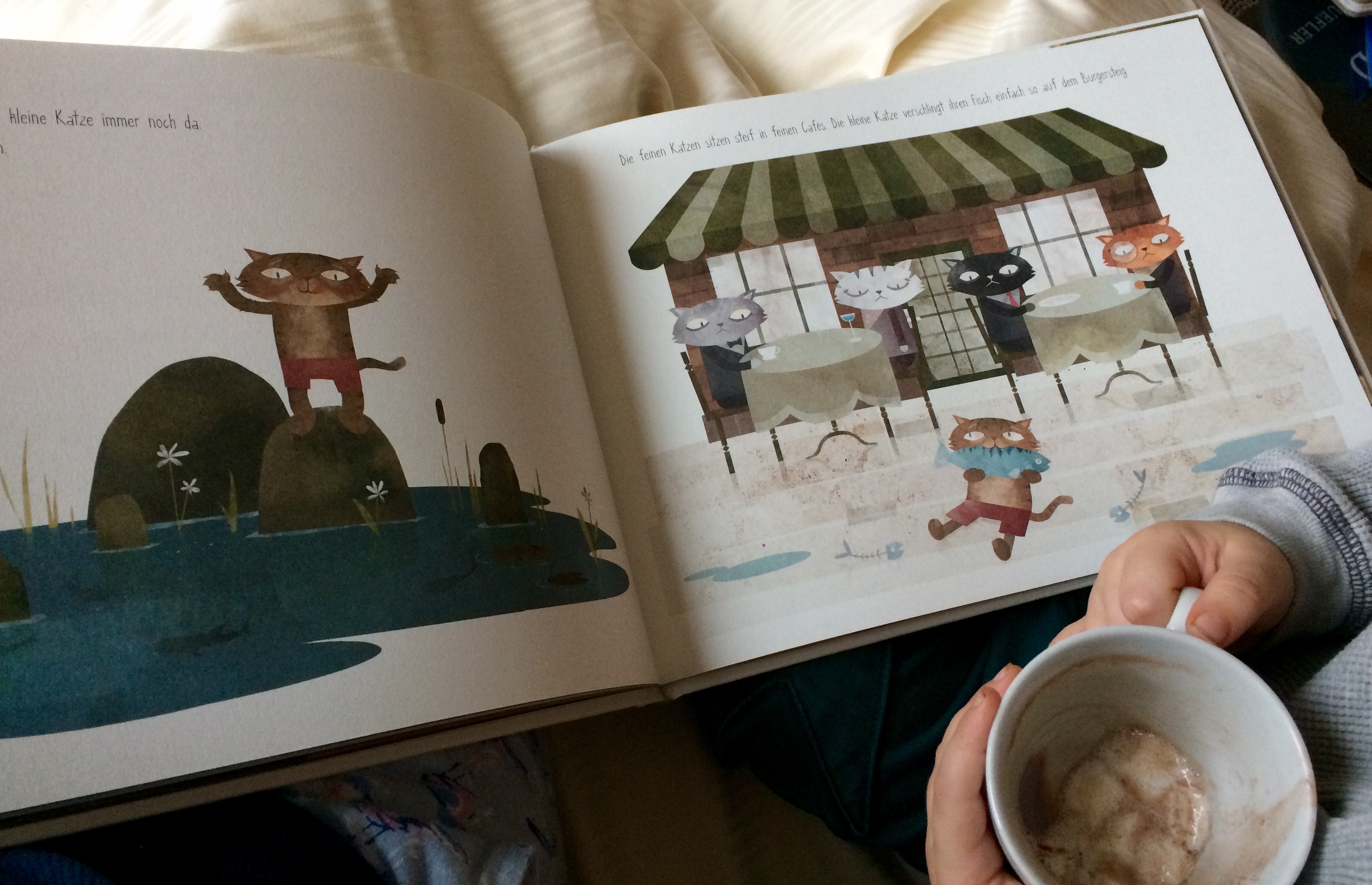 Bug insisted we read this on a recent visit to the local book store and he didn’t have to twist my arm too hard. The dour looking cats on the cover in their suits and with large black umbrellas were so spectacularly illustrated that I had to check it out. My only disappointment is that this book isn’t published in English yet and so more people aren’t yet aware of the gem that Morgane de Cadier and Florain Pigé have created.
