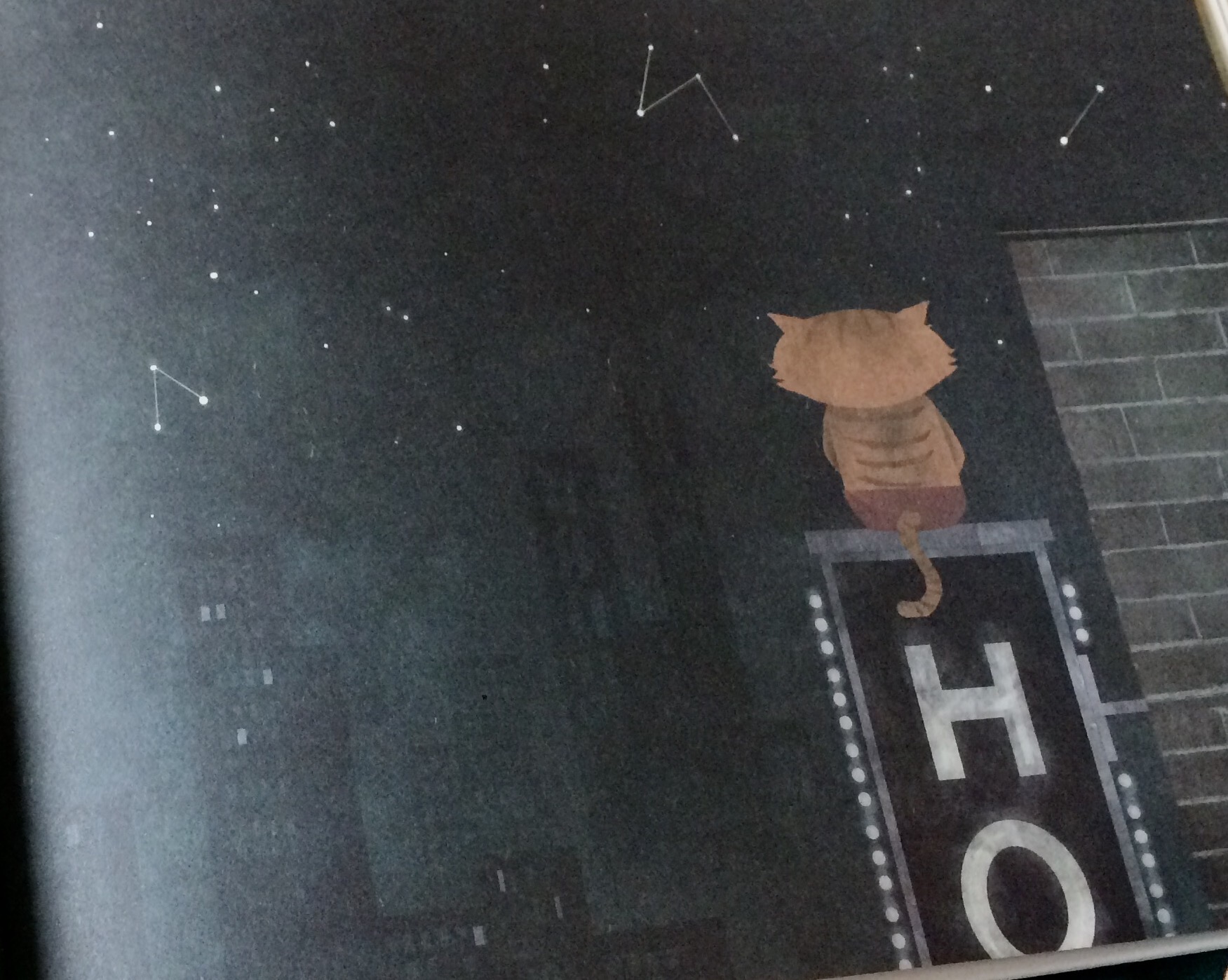 Pigé shines throughout this book. The illustrations seem to shimmer though they are done with an intentionally grey and deary color scheme. The little wild cat defies this and only blends in for a single page. His antics are amusing and definitely chuckle worthy and the fine cats are made to look so preposterously stuffy that it’s hard not to laugh at them in their three-piece suits. My favorite page includes a cat walking his pet dog in the park. Bug didn’t quite understand why that was amusing but we he gets it it will be a light bulb moment. Overall, this is an incredible pairing between two strong talents that was beautifully executed. I’m almost tempted to learn French in order to read the additional titles that these two have available.