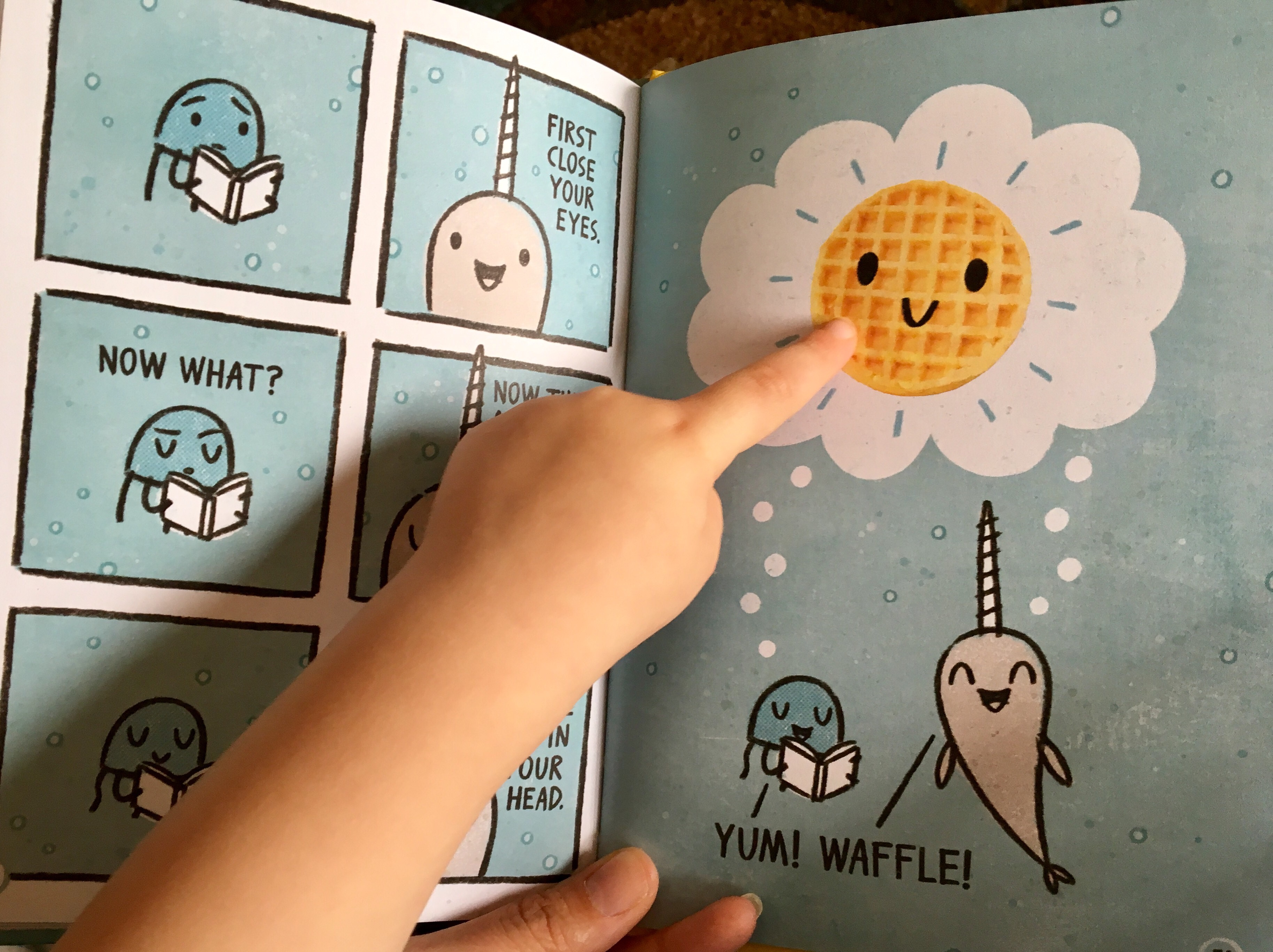 Narwhal and Jelly are just the type of characters that I’d want Bug to be exposed to and so if we sing the Narwhal song thirty times in a row or reread or rerereread the book; I’m not bothered. Books are meant to invade our lives and make us consider the world and people around us. Narwhal and Jelly do that perfectly, inspiring such amazing attributes that I only wish we had more of them. Inspired by his love of the book, my husband brought home a box of round toaster waffles that commonly feature in the story. The next morning when we presented Bug with a special surprise breakfast, he squealed with delight and excitedly told us that Narwhal must have left them for him in the freezer last night. I didn’t have the heart to correct him and LOVED hearing his thank yous to Narwhal as he consumed the final bites.