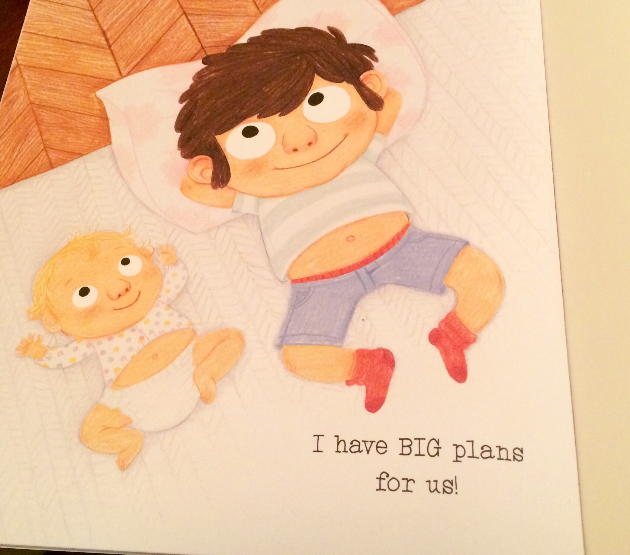 As readers, we follow the older brother as he discuss the changes in his life now that he has a new sister. His observations are truly made with a child’s perspective stating things like: “It wasn’t my idea.” and “After all that waiting, there she was. I thought she would be bigger.” Krensky addresses the issue of attention as the older brother does everything the baby does but with no attention given. But Krensky quickly passes this and moves on to other differences and similarities that are given the brunt of attention in the book. I liked that positive approach and how constant the writing style stayed. The older brother notes that unfortunately the baby can’t eat delicious things like pizza and ice cream or how she’ll need a good teacher to become an expert splasher in the bath. A number of other things are considered important but the ending is the best. For as the siblings lie back on the bed, in the same pose, and the brother thinks: “I have big plans for us!”